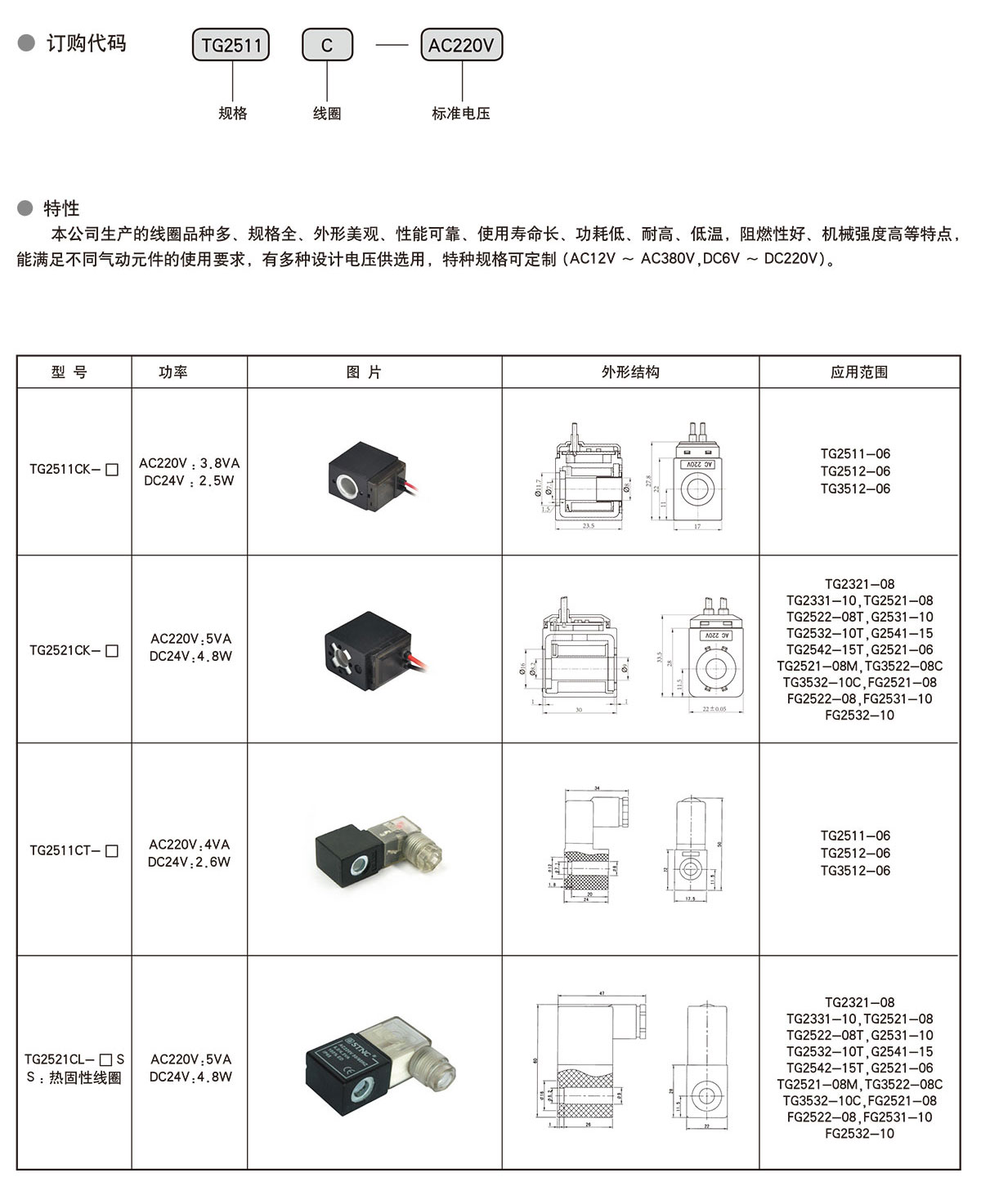 الميزات : لدينا مجموعة متنوعة من لفائف ، مواصفات كاملة ، والمظهر الجميل ، وأداء موثوق بها ، والخدمة الطويلة في الحياة ، وانخفاض استهلاك الطاقة ، ومقاومة درجات الحرارة العالية والمنخفضة ، مثبطات اللهب جيدة ، وارتفاع القوة الميكانيكية ، يمكن أن تلبي متطلبات استخدام مختلف مكونات تعمل بالهواء المضغوط ، وهناك مجموعة متنوعة من تصميم الجهد للاختيار من بينها ، مواصفات خاصة يمكن تخصيصها ( ac12v ~ ac380v dc6v ~ dc220v ) .